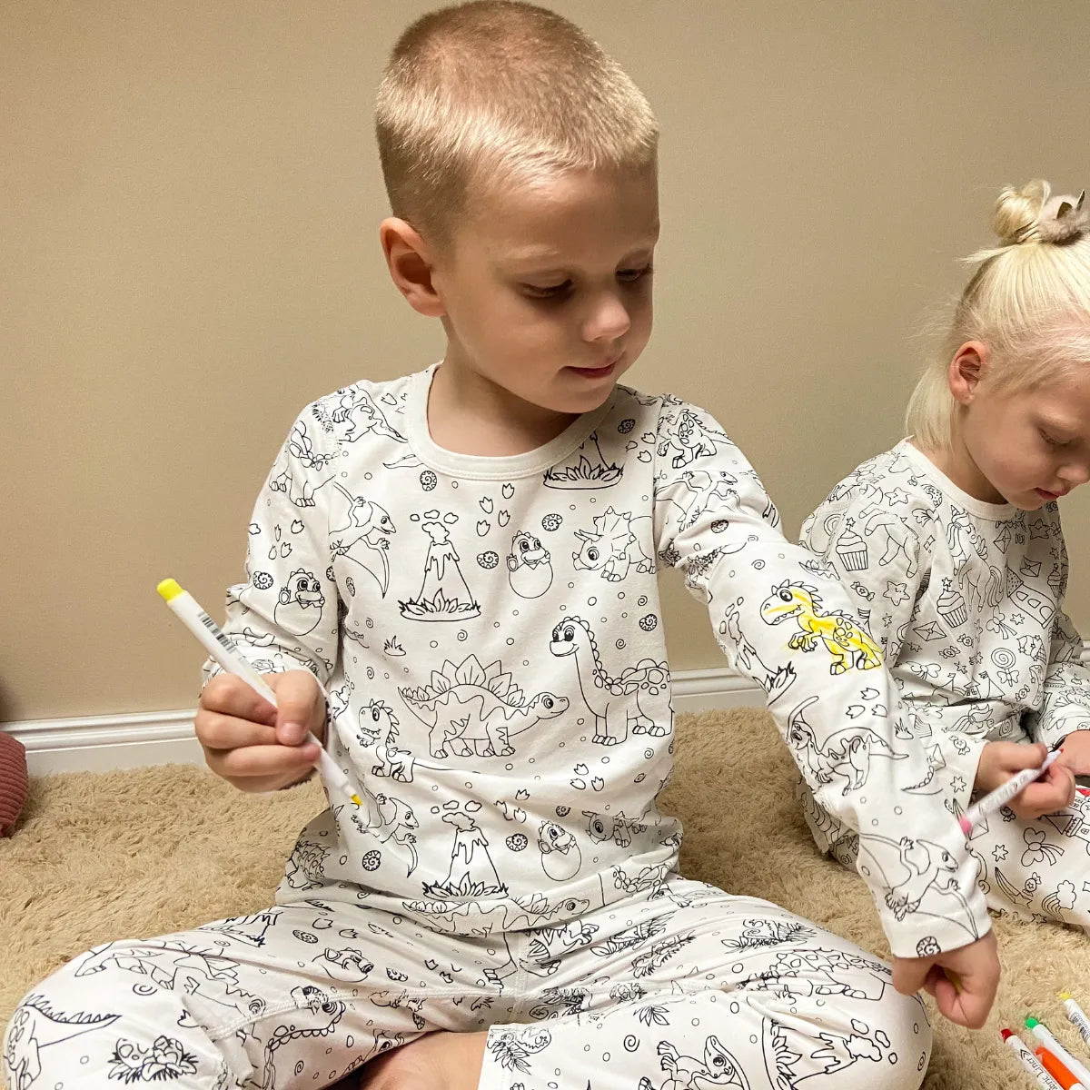 Questo morbido pigiama a due pezzi in 100% cotone presenta magici motivi di dinosauri che il tuo bambino può colorare per creare un capo unico e personalizzato.