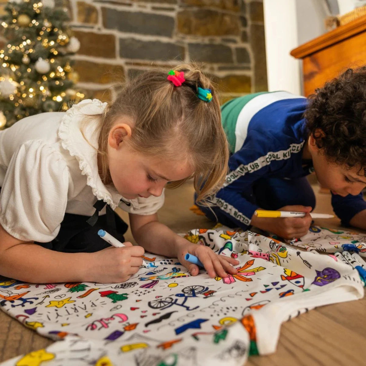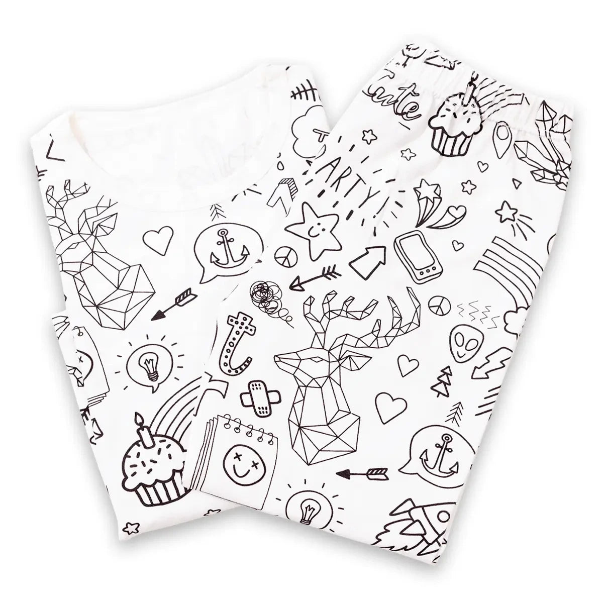 Questo morbido pigiama in due pezzi, realizzato in 100% cotone, presenta allegri motivi a tema festa che il bambino può colorare, creando un capo unico e personalizzato. Una volta finita la colorazione, lascia asciugare per 24 ore, poi lavalo – ed è pronto da indossare!